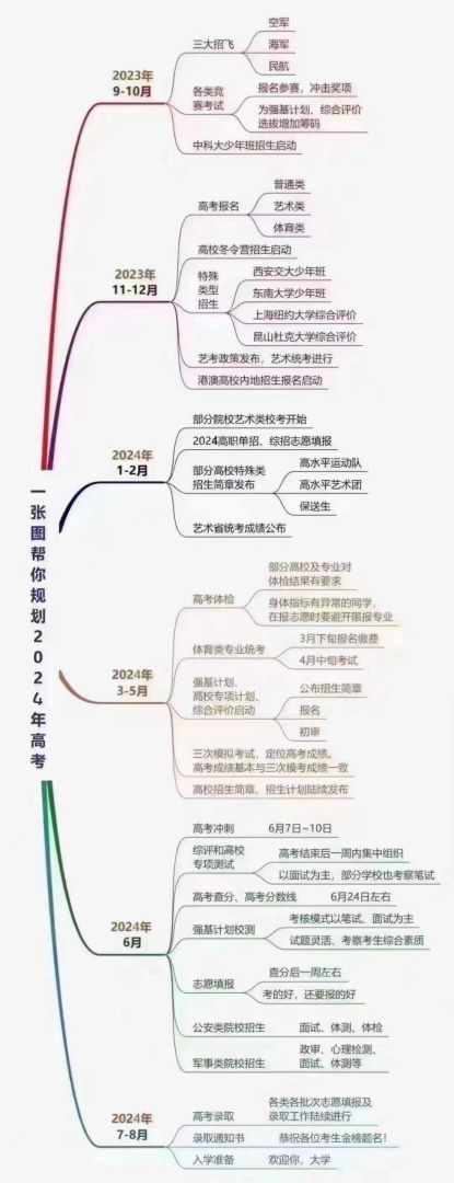 2024年高职单招、综合招生志愿填报开始、部分艺术类院校校考开启,各位艺术生应当时刻注意艺术类院校的校考要求与时间;部分高校的特殊类招生简章发布,例如高水平运动队、高水平艺术团以及保送生;最后艺术生的统考成绩也将在这个时间段公布。