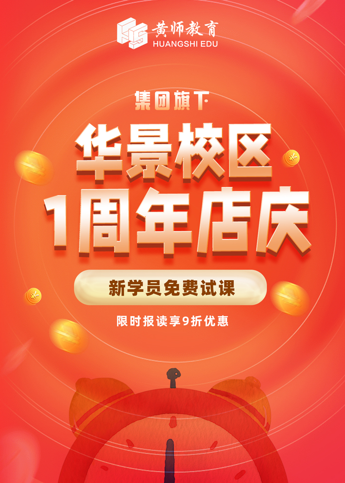 自4月10日开始,黄师教育华景校区将开启限时报读享受9折优惠的福利活动!同时在周年庆期间,黄师教育华景校区将会开启新学员免费试课活动。感兴趣的学生们能够到店体验老师们专业的教学辅导能力。